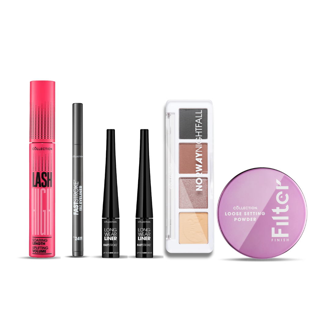 Create chilling contrasts with the Halloween Skeleton Makeup Bundle. With bold black and white liners, mascara, setting powder, and a mini eyeshadow palette, this kit is perfect for spooky skeleton, skull, and gothic glam looks.
